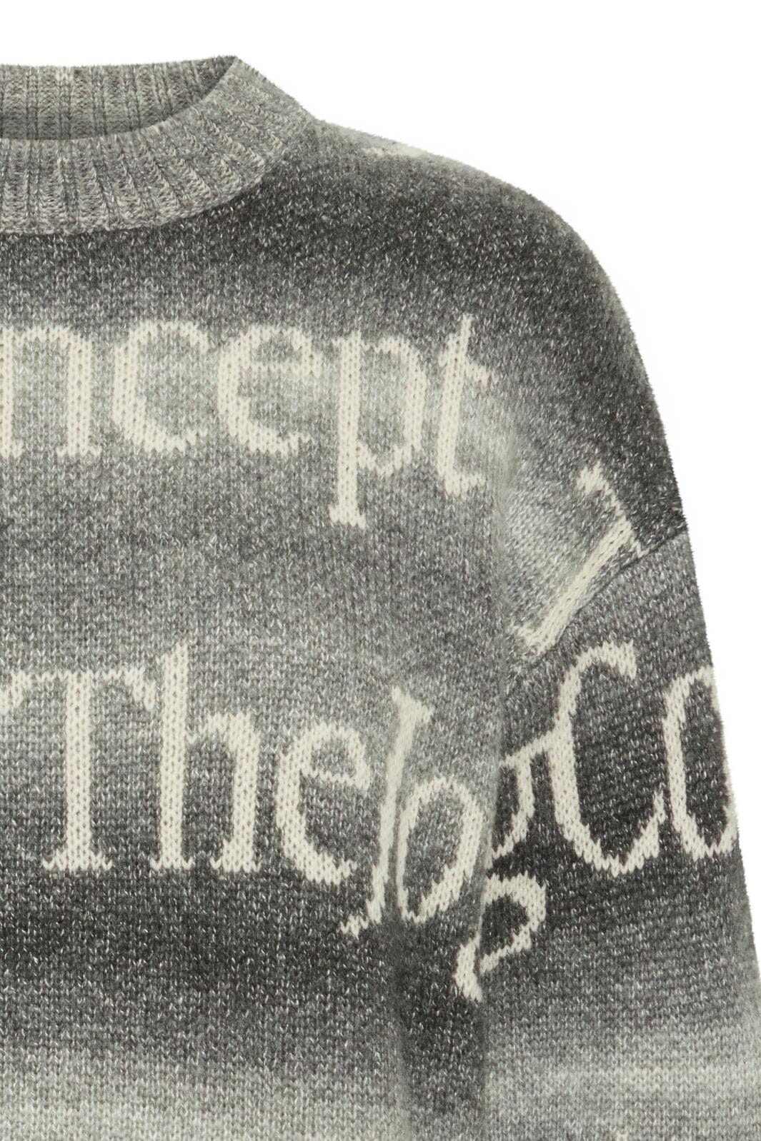 Strickpullover von The Jogg Concept mit grauen Farbverläufen. Sie hat einen Rundhalsausschnitt und lange Ärmel. Das Muster besteht aus dem Markennamen in hellen Buchstaben auf dem dunkelgrauen Hintergrund.