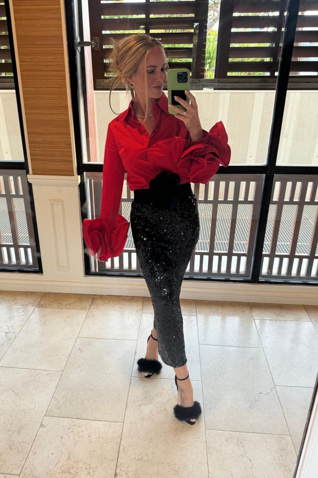 Schwarzer Rock von Valentin Studio mit Pailletten. Er hat eine hohe Taille und reicht bis zur Mitte der Wade. Die Pailletten erzeugen einen glänzenden Effekt auf der einfarbigen Oberfläche.