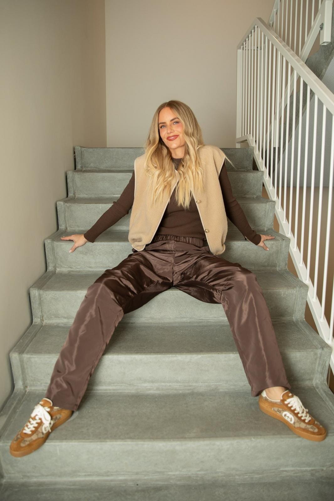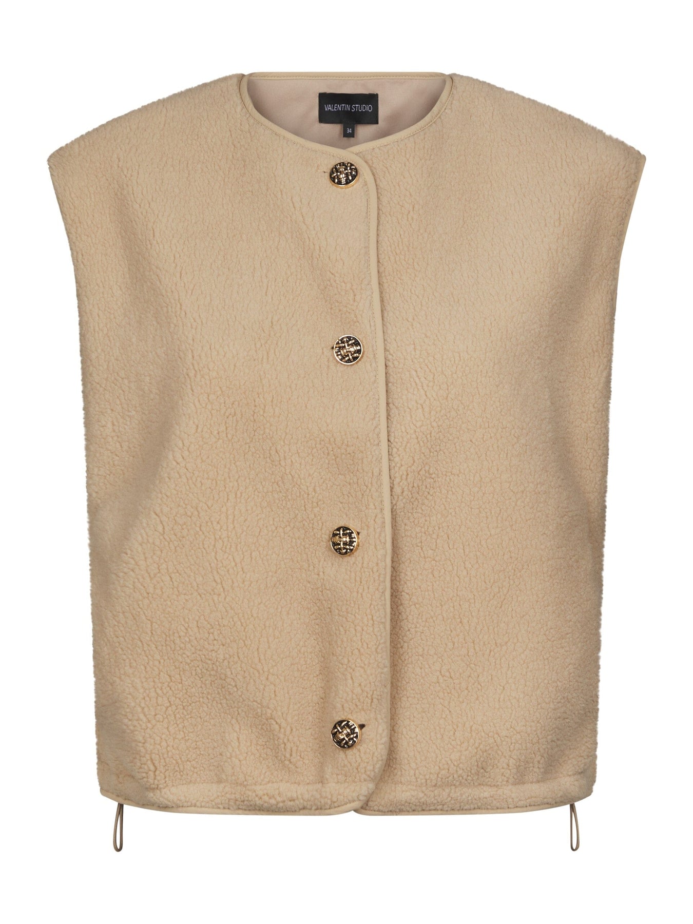 Sandfarbene flauschige Weste von Valentin Studio. Sie hat einen Knopfverschluss vorne und ein ärmelloses Design mit rundem Halsausschnitt.