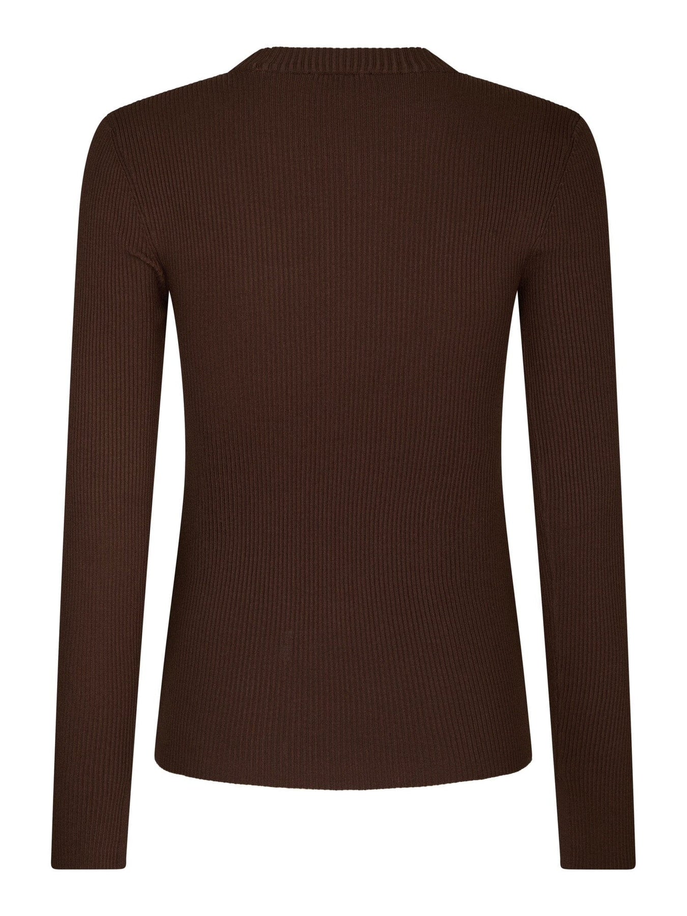 Dunkelbrauner Strickpullover von Valentin Studio mit dünn gestrickter Textur. Der Pullover hat eine figurbetonte Passform und dekorative goldene Knöpfe an den Schultern, die einen schönen Akzent setzen.