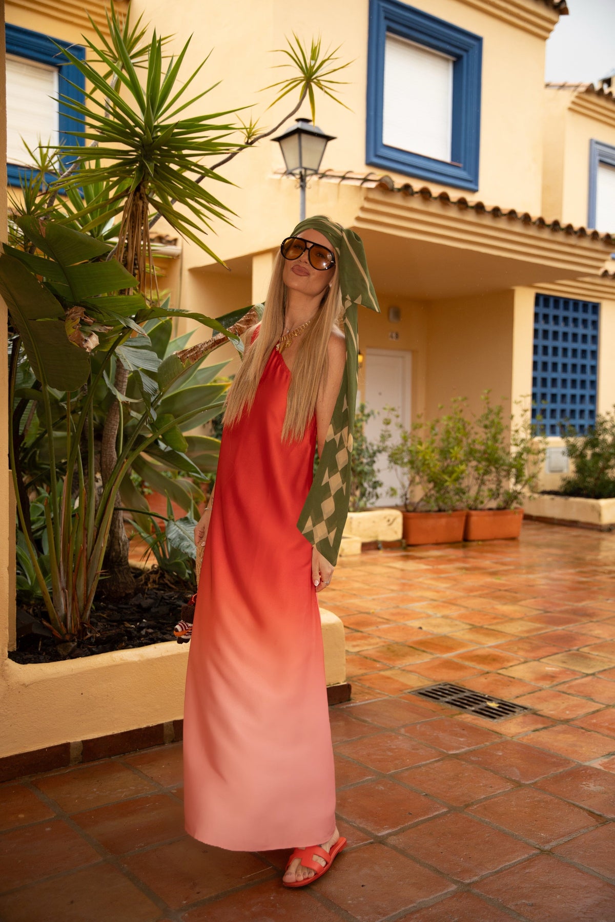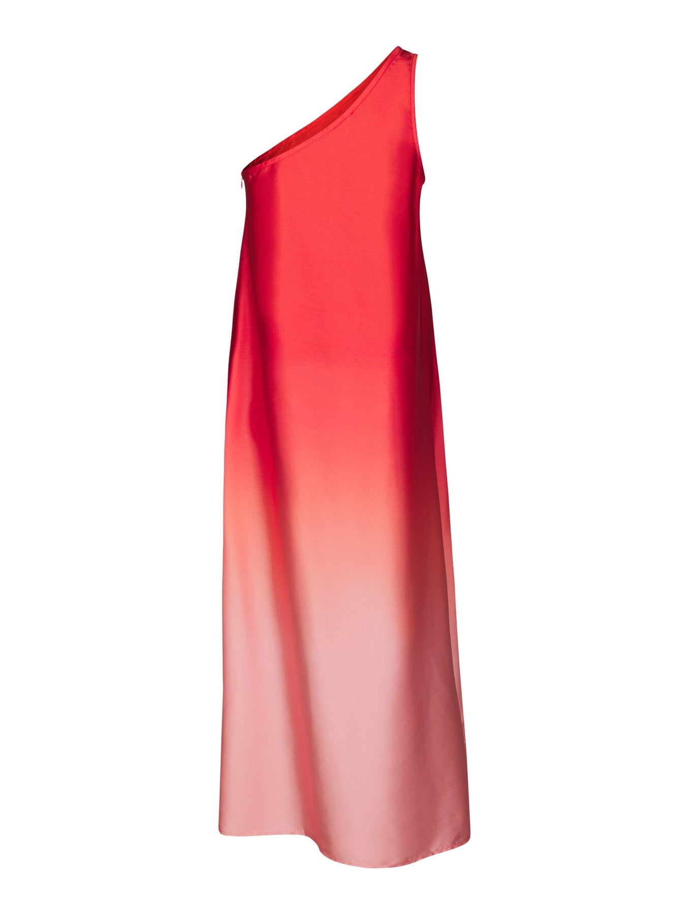 Rotes Kleid von Valentin Studio mit Ombre-Farbverlauf und Off-Shoulder-Design. Das Kleid ist knöchellang und hat eine lockere Passform.