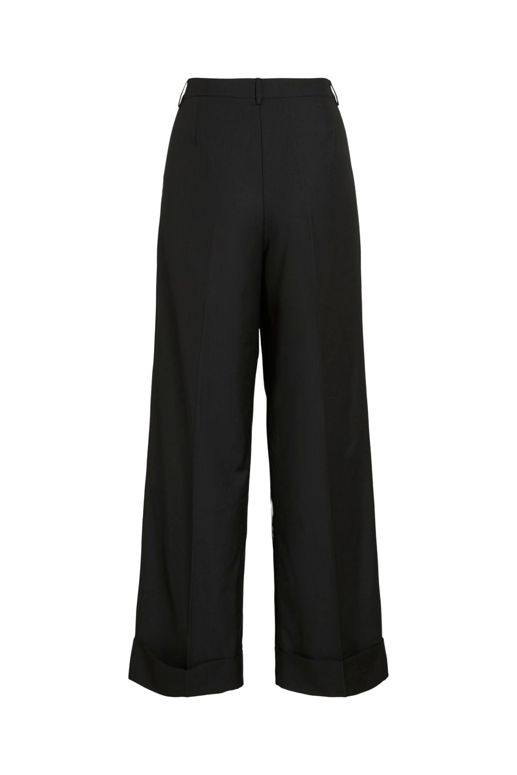 Schwarze Hose von Vila mit hoher Taille und lockerer Passform. Die Hose hat weite Beine mit umgeschlagenen Manschetten und Gürtelschlaufen in der Taille. Sie ist mit Seitentaschen sowie einem praktischen Reißverschluss- und Knopfverschluss ausgestattet.