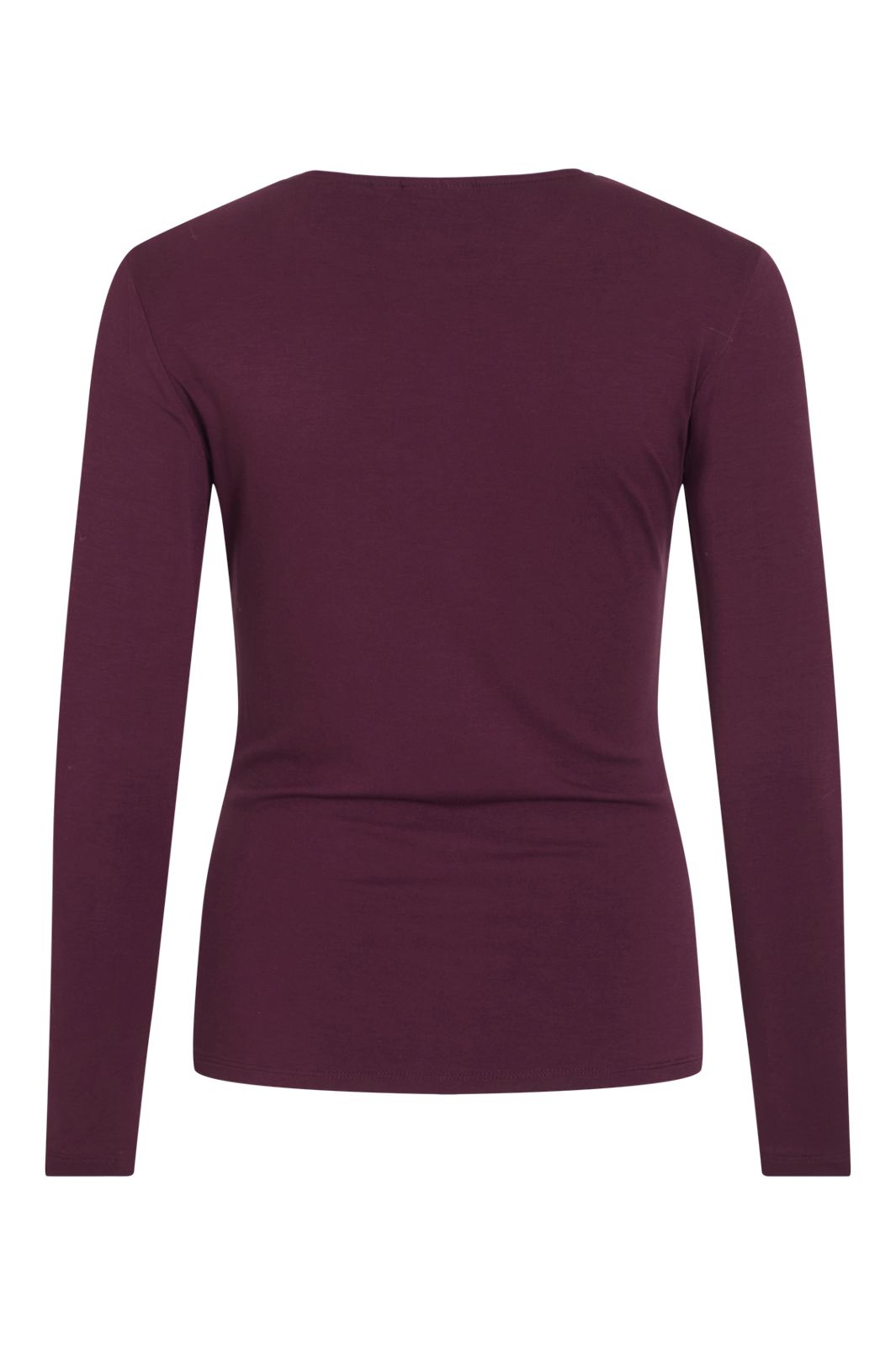 Bordeauxfarbene Langarmtop von Vila mit Rundhalsausschnitt. Das Top hat drapierte Details auf der Vorderseite und eine figurbetonte Passform.