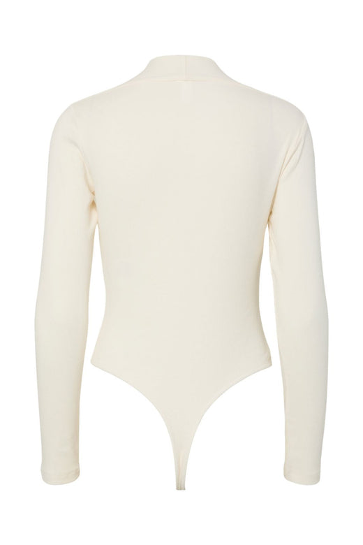 Cremefarbene Body von Y. A.S mit V-Ausschnitt und langen Ärmeln. Sie besteht aus biologischer Baumwolle mit Stretch und hat eine figurbetonte Passform.