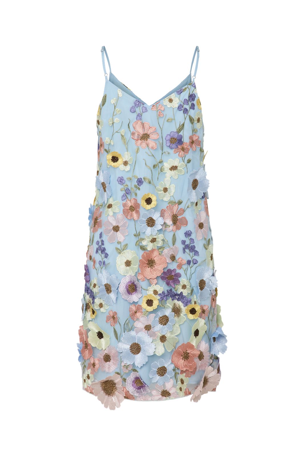 Himmelblaue Kleid von Y.A.S mit gestickten Blumen in verschiedenen Farben. Das Kleid hat dünne Träger, einen V-Ausschnitt und eine lockere Passform, die viel Bewegungsfreiheit bietet.