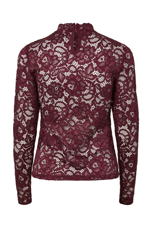 Spitzenoberteil von Y. A.S in bordeauxrot mit hohem Kragen und langen Ärmeln. Das Oberteil hat ein blumiges Spitzenmuster, Rüschendetails sowie eine Knopfleiste im Nacken.