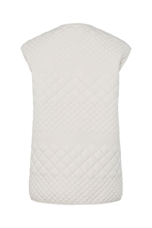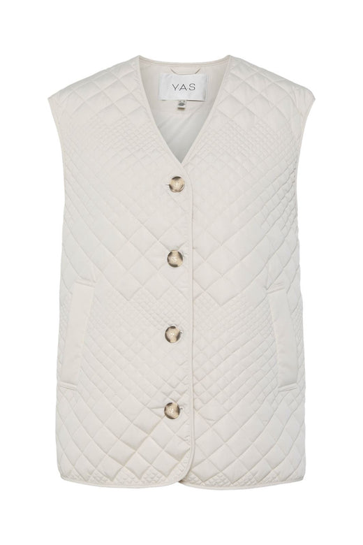 Ärmellose Weste von Y. A.S in einer hellen Birkenfarbe. Die Weste hat ein gestepptes Design mit V-Ausschnitt und Knopfverschluss vorne. Die praktischen Seitentaschen machen sie im Alltag nützlich.
