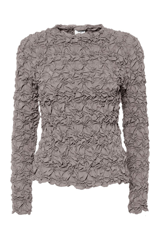 Langärmliges Oberteil von Y. A.S aus graubraunem Polyester. Das Oberteil hat eine durchgehende gekräuselte Struktur, einen runden Halsausschnitt und eine körpernahe Passform.