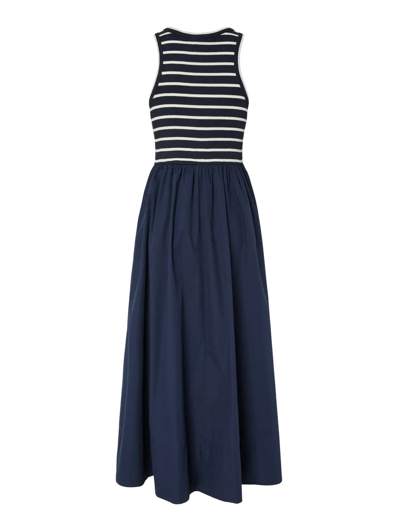 Langes Kleid von Y.A.S mit gestreiftem Oberteil und unifarbenem Rock in Dunkelblau und Weiß. Das Kleid hat ein ärmelloses Design mit rundem Halsausschnitt.