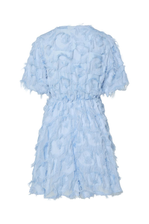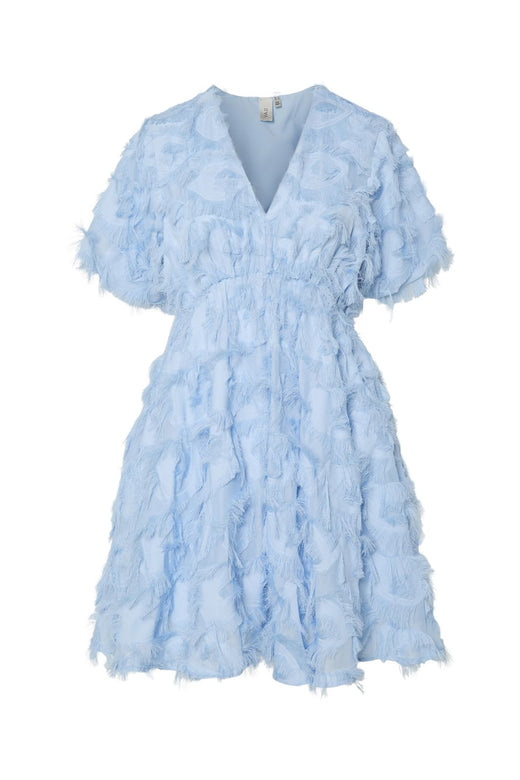 Himmelblaue Kleid von Y.A.S mit Fransen-Details über den gesamten Stoff. Das Kleid hat einen V-Ausschnitt und 3/4-Ärmel, die eine schöne Balance zwischen Bedeckung und Bewegungsfreiheit bieten.