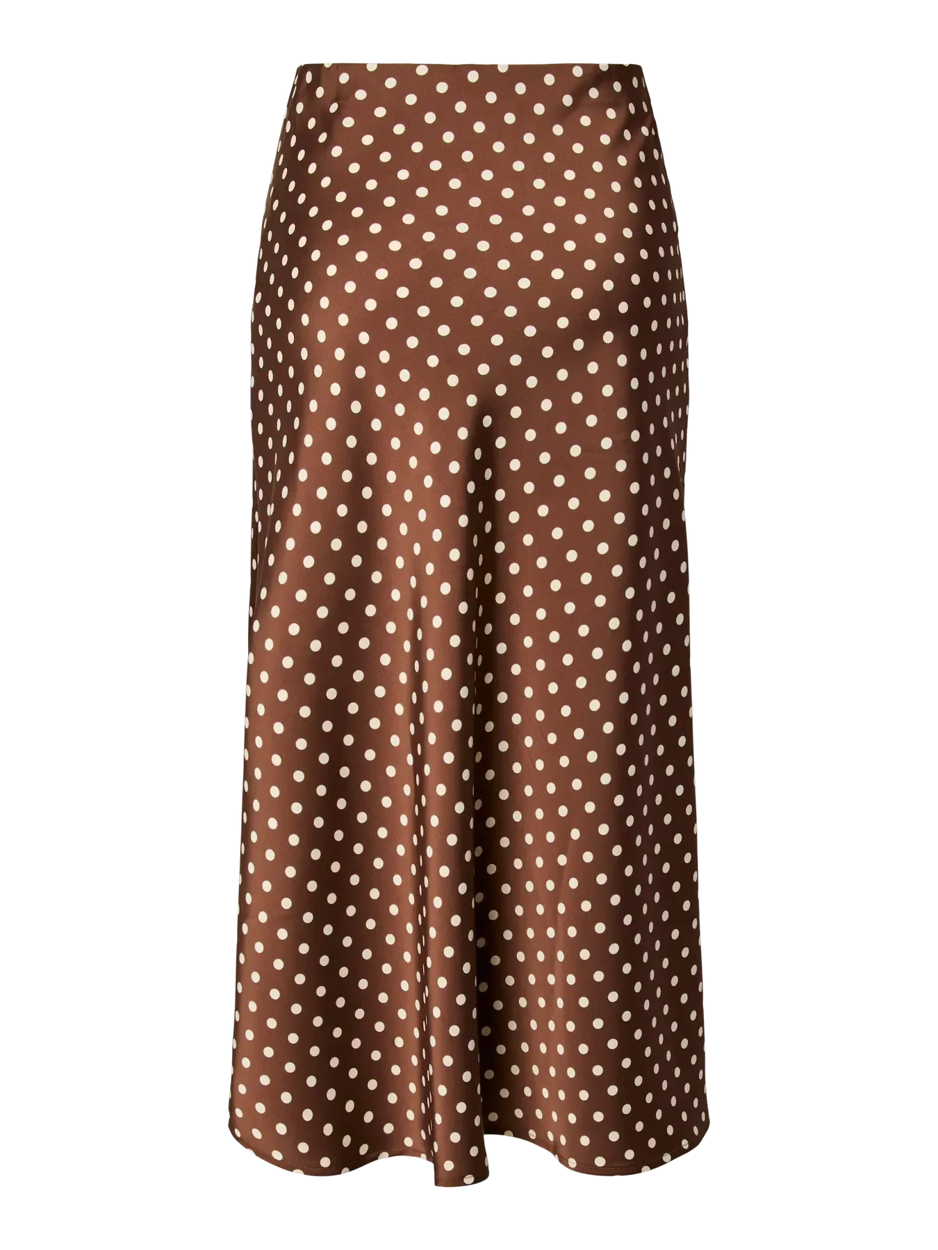 Brauner Midi-Rock von Y. A.S mit weißen Punkten. Der Rock besteht aus recyceltem Polyester mit einem leichten Drapierungseffekt und reicht bis zur Mitte der Wade.