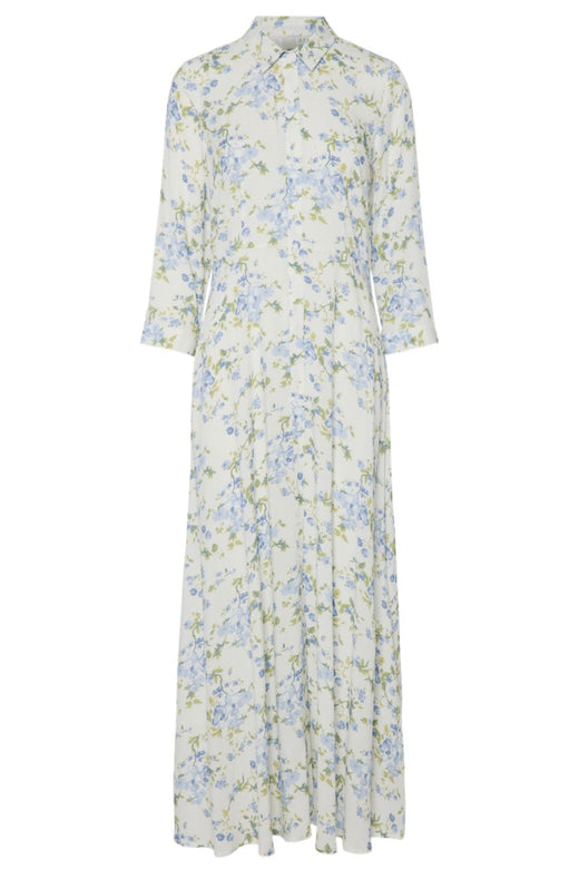 Langarmiges Hemdkleid von Y. A.S mit Blumenmuster in Blau- und Weißtönen. Das Kleid hat eine Knopfleiste bis nach unten, einen V-Ausschnitt und dreiviertellange Ärmel.