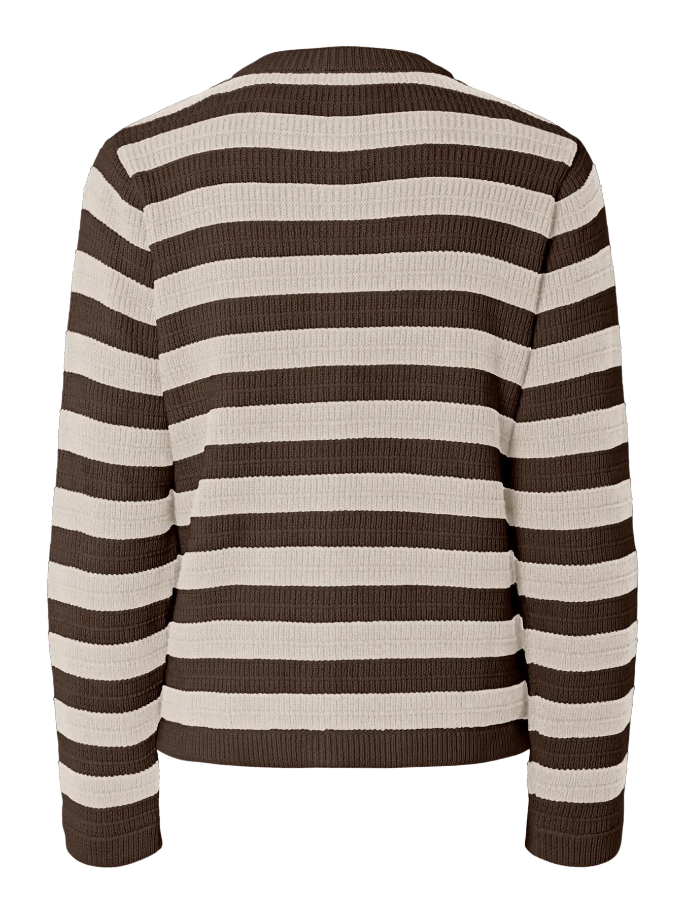 Strickjacke von Y. A.S mit horizontalen Streifen in schokoladenbraun und beige. Sie hat einen runden Halsausschnitt und goldene Knöpfe vorne.