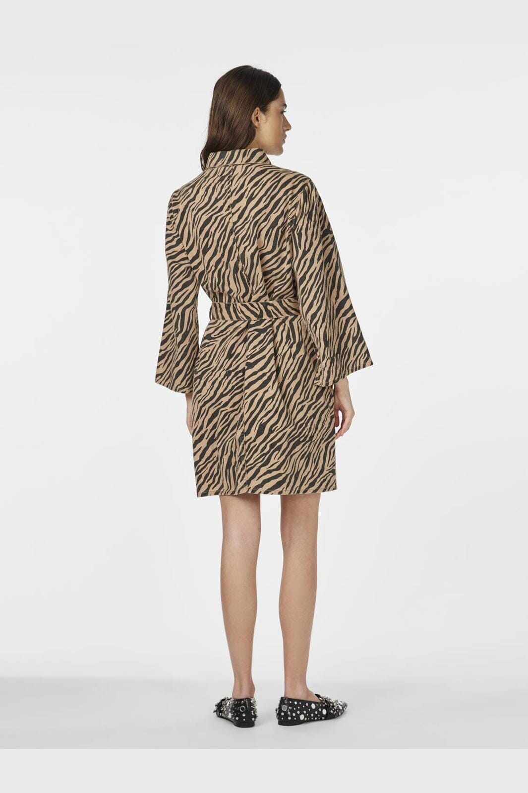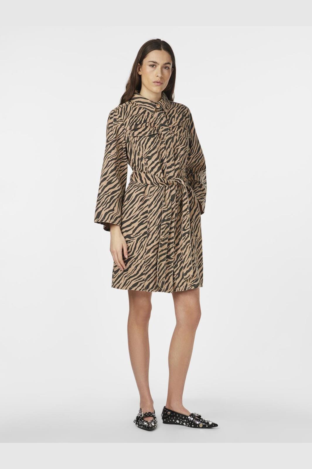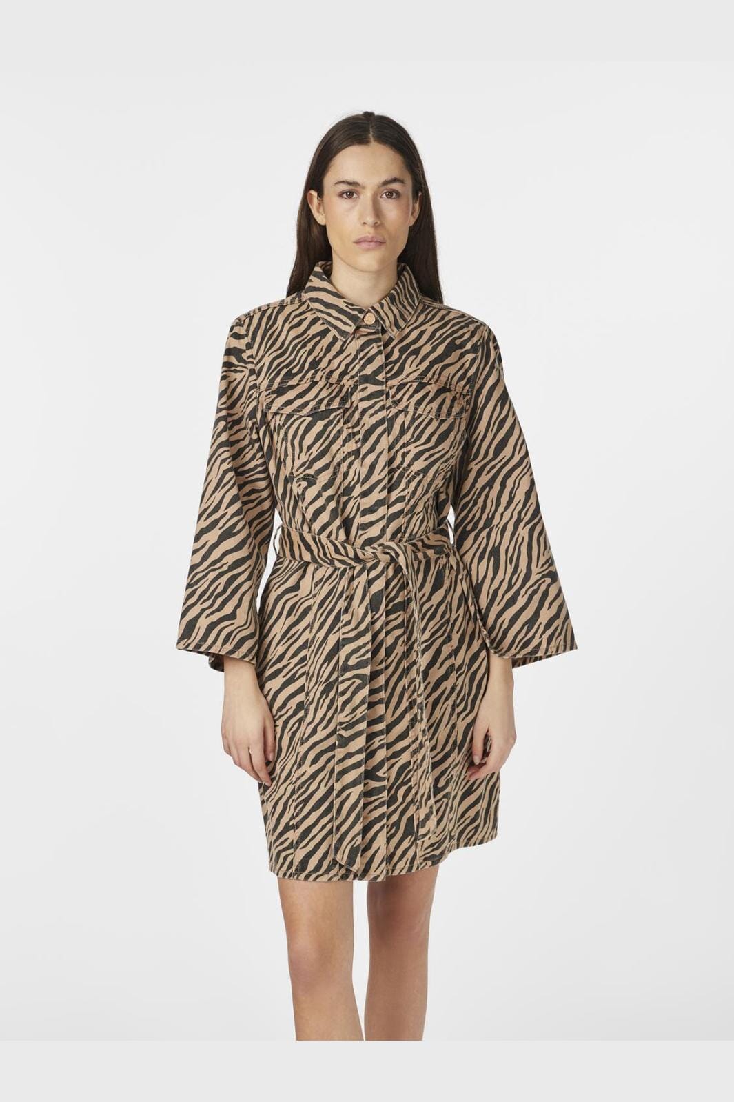 Denim Hemdkleid von Y. A.S mit tigerstreifigem Muster in Beige und Schwarz. Das Kleid hat einen Hemdkragen, 3/4-Ärmel und zwei Brusttaschen auf der Vorderseite.
