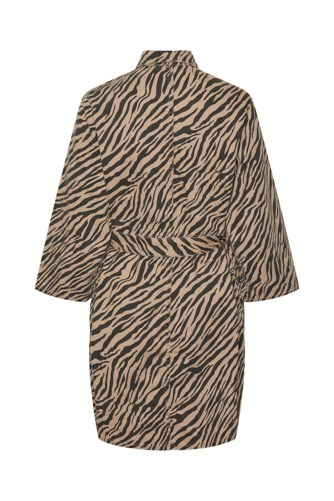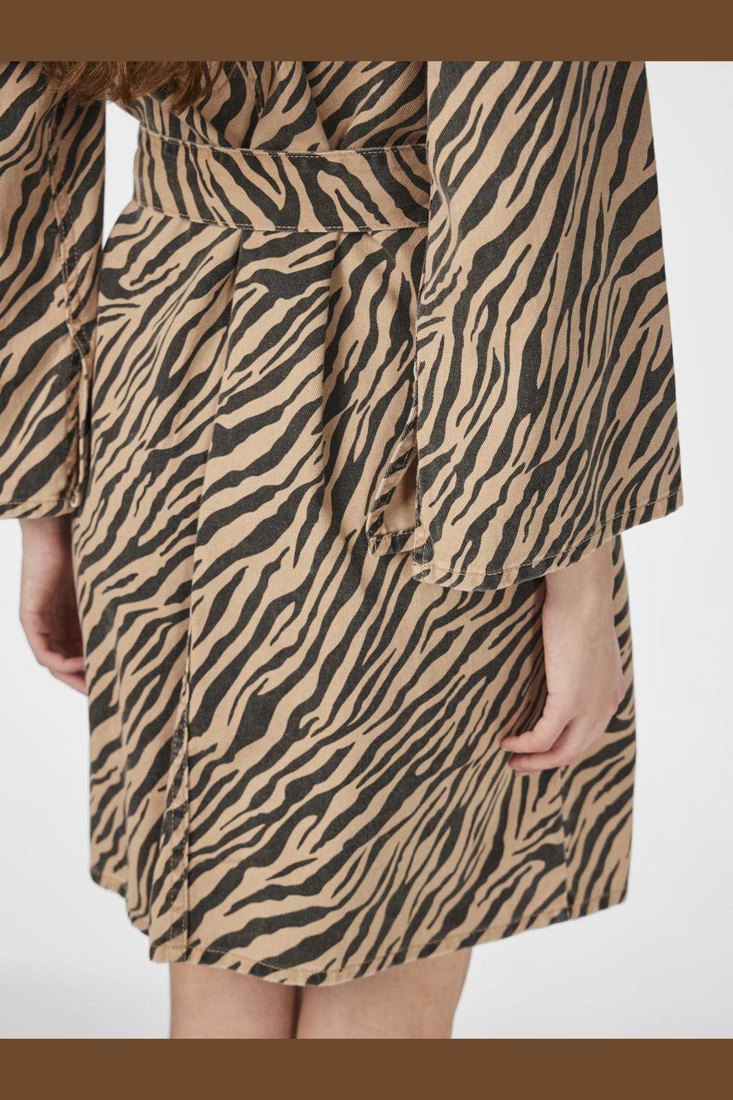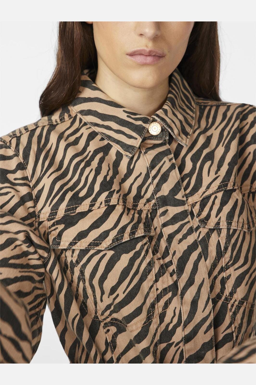 Denim Hemdkleid von Y. A.S mit tigerstreifigem Muster in Beige und Schwarz. Das Kleid hat einen Hemdkragen, 3/4-Ärmel und zwei Brusttaschen auf der Vorderseite.