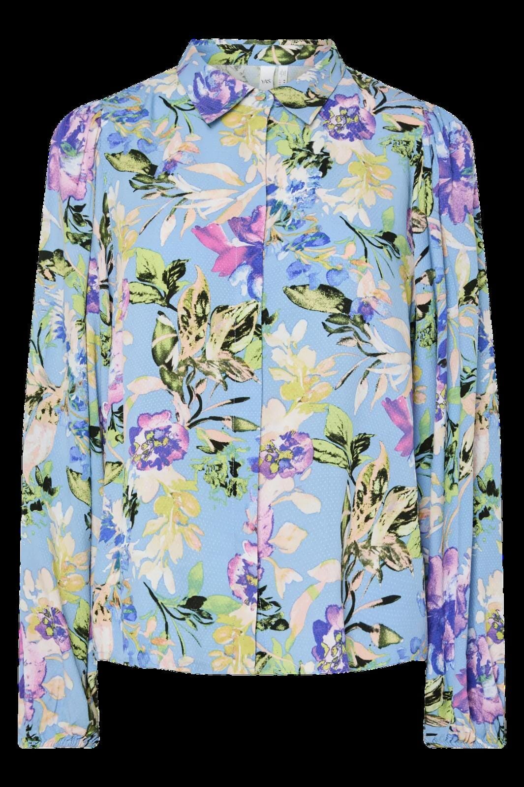 Hemd von YAS, gefertigt aus 100% Lenzing™ Ecovero™ Viskose. Der geblümte Print in Lila- und Hellblautönen bedeckt die gesamte Oberfläche des Hemds.
