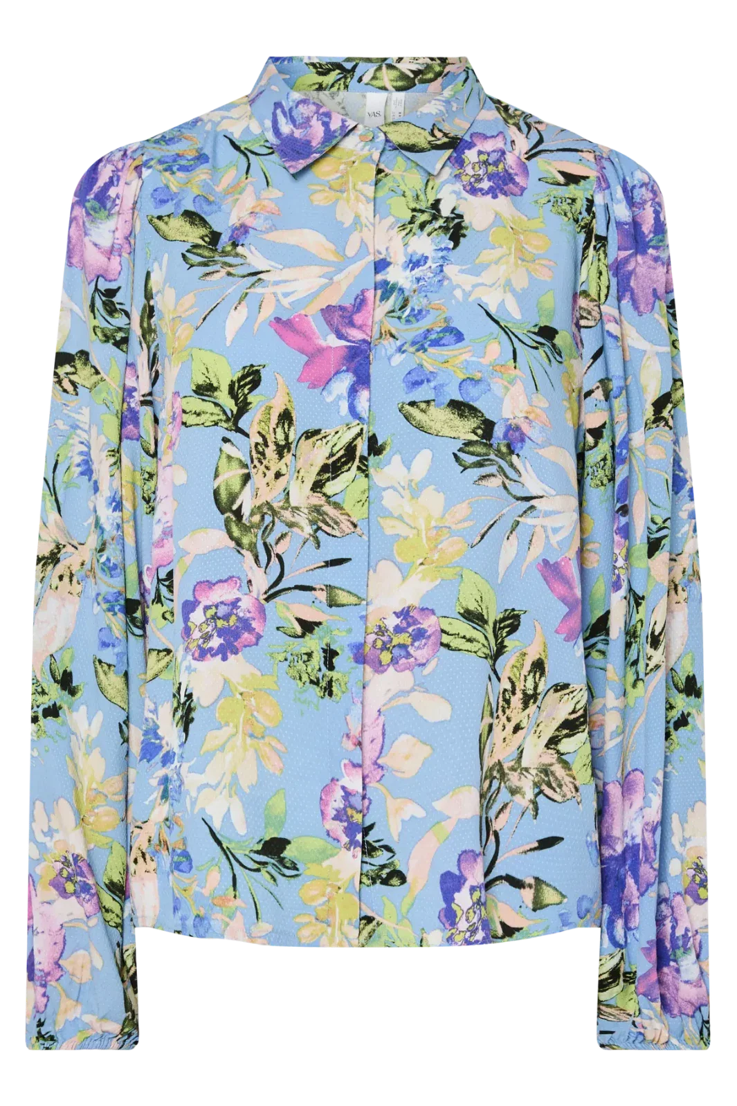 Hemd von YAS, gefertigt aus 100% Lenzing™ Ecovero™ Viskose. Der geblümte Print in Lila- und Hellblautönen bedeckt die gesamte Oberfläche des Hemds.