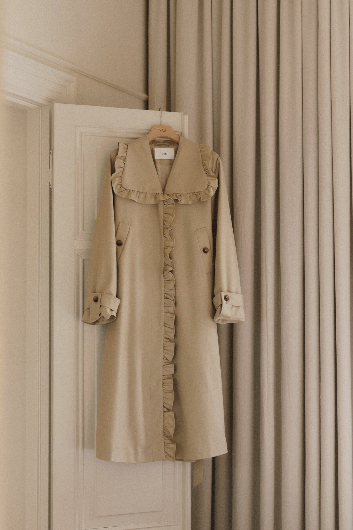 Langer Trenchcoat von YAS in einem beigefarbenen Ton. Der Mantel hat Rüschen entlang des Kragens und an der Vorderseite sowie einen Gürtel mit Bindeband in der Taille.