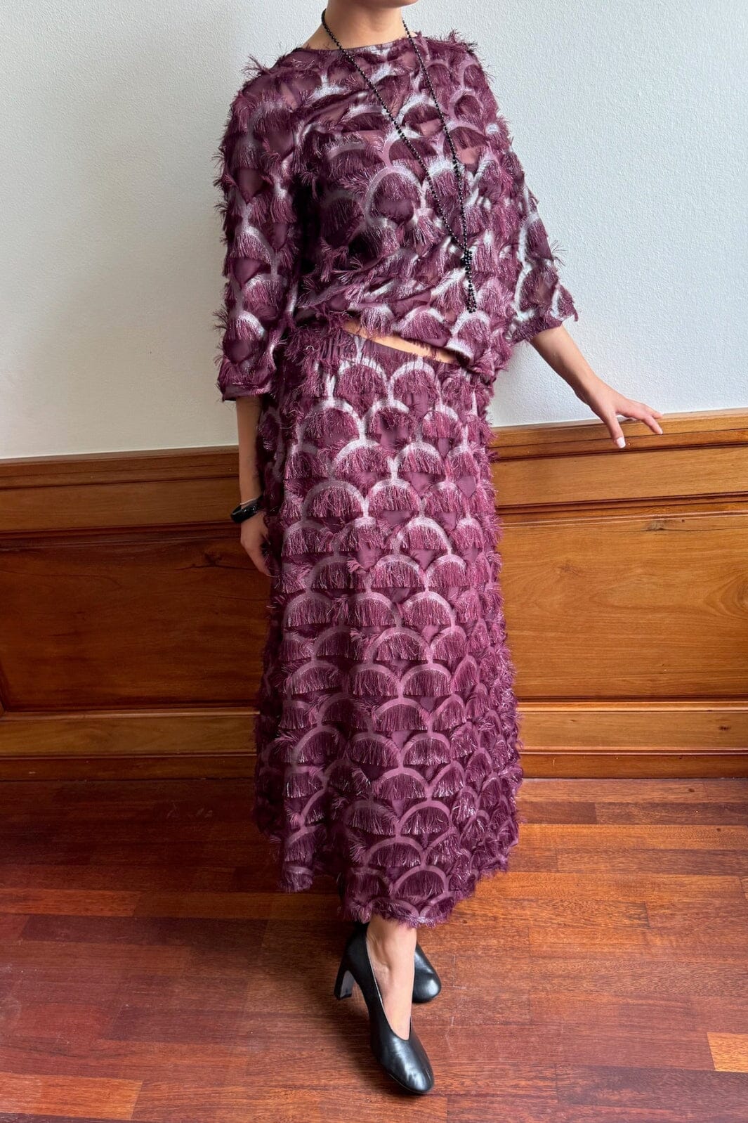 Top von YAS, aus 100 % Polyester in einem bordeauxroten Farbton mit metallischem Glanz. Der Top hat ein Muster aus Halbkreisen mit Fransen.