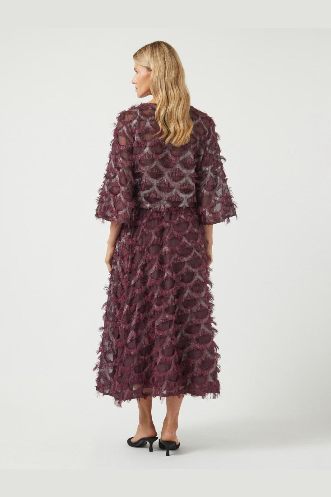 Rock von YAS, aus 100 % Polyester in einem tiefen burgunderroten Farbton mit metallischem Druck und Fransen auf der gesamten Oberfläche.
